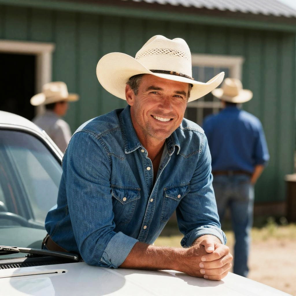 A man wearing a white V-neck shirt and a tan cowboy hat leans confidently on a wooden fence while holding a black remote control in his right hand. In the background, a woman with brown hair wearing a blue shirt stands near the white door of a red brick house. The sunlight casts soft shadows over the scene, highlighting the man’s smile as the woman looks away.