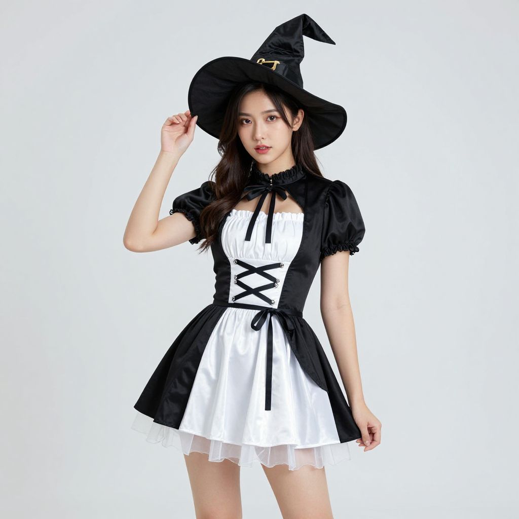 Photograph of an Asian woman in a black witch hat and white-and-black dress with black ribbon accents, standing against a white background.