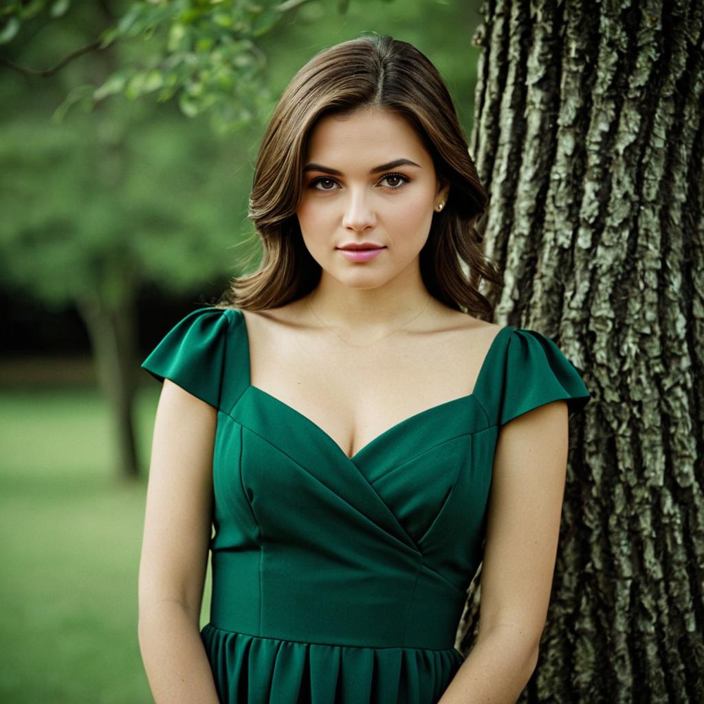 Dark green formal dress,1girl, solo, dress, green dress, realistic, looking at viewer, blurry, brown hair, blurry background, tree, outdoors, brown eyes