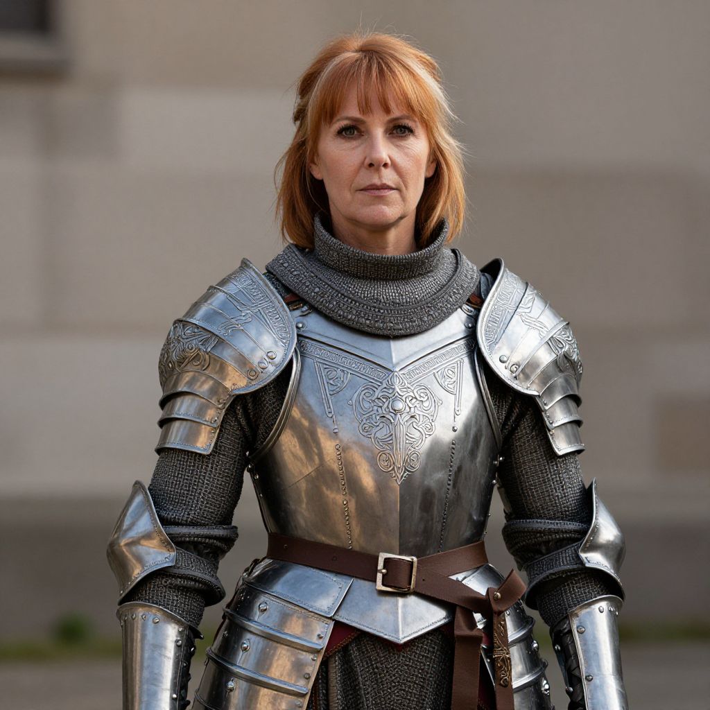 A middle-aged woman with short red and golden hair, wearing detailed medieval armor with intricate designs, stands confidently.