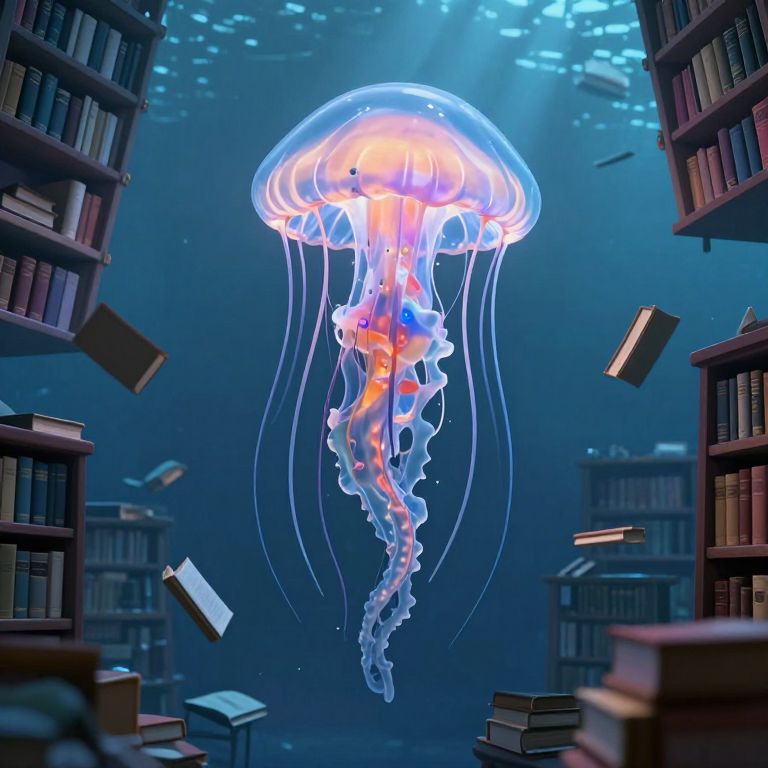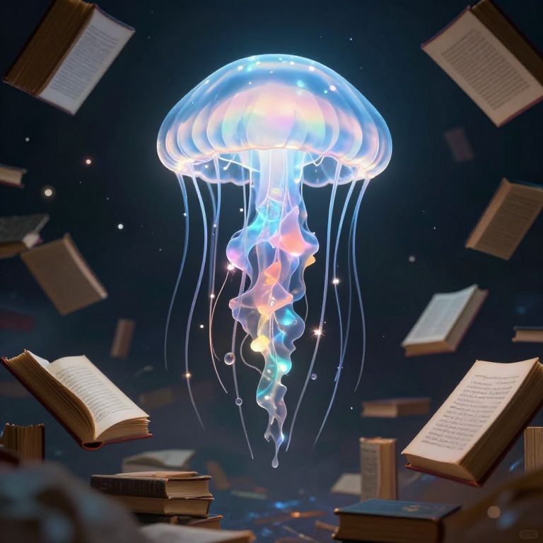 Translucent jellyfish hovers gracefully above an ancient stone library, its pulsating body emitting a soft glow that illuminates floating books suspended in mid-air, creating a mesmerizing scene of knowledge and wonder.