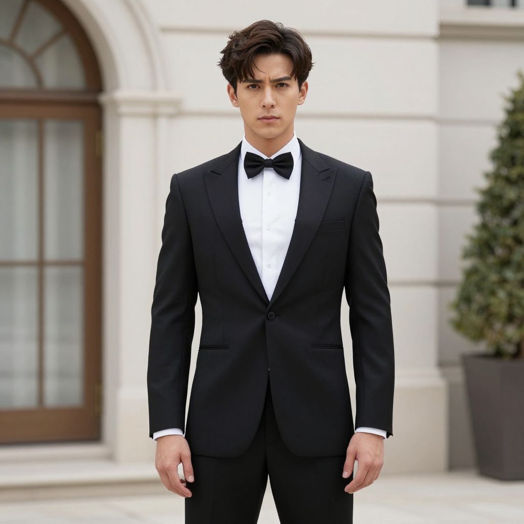 Photograph of a young Asian man with fair skin and dark, slightly tousled hair. He stands confidently in front of a white, ornate building with arched windows and a wooden door. He is wearing a sleek, black tuxedo with a white dress shirt and a black bow tie. His expression is serious and focused. In the background, there is a potted green shrub on the right side. The overall style is formal and elegant, with a sharp contrast between the dark suit and the bright background.