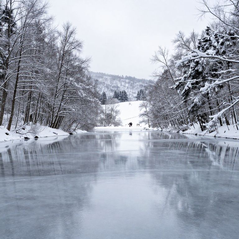 Photograph of a serene winter landscape featuring a frozen river in the foreground, reflecting the overcast sky. Snow-covered trees with bare branches line both sides of the river, creating a symmetrical pathway. The trees are dark green and black, contrasting with the bright white snow. In the background, a snow-covered forest and a bright, snowy horizon are visible. The water on the river is calm, with a smooth, glass-like texture. The overall color palette is dominated by whites, blues, and grays, evoking a cold, tranquil winter atmosphere.