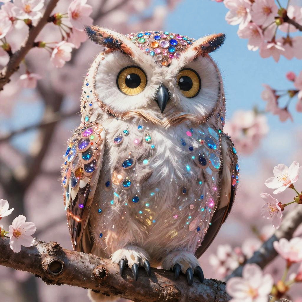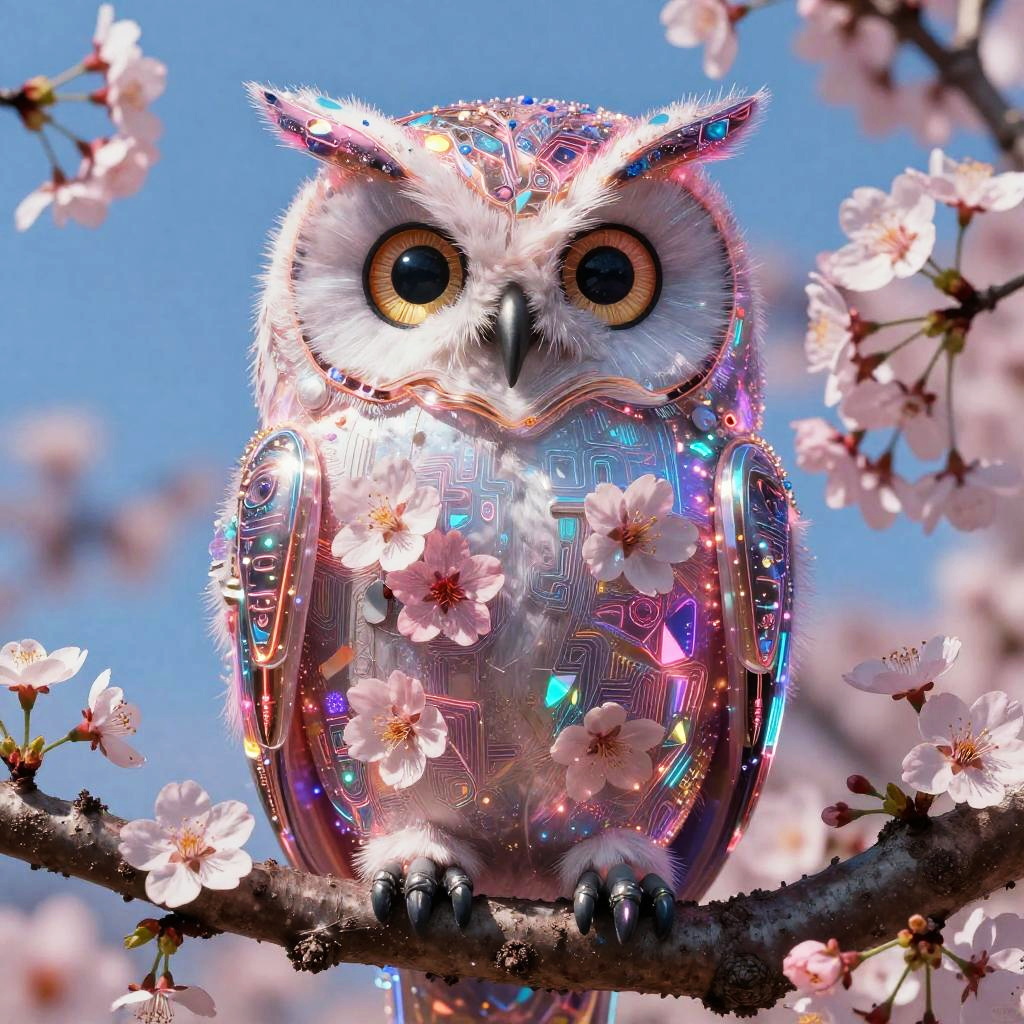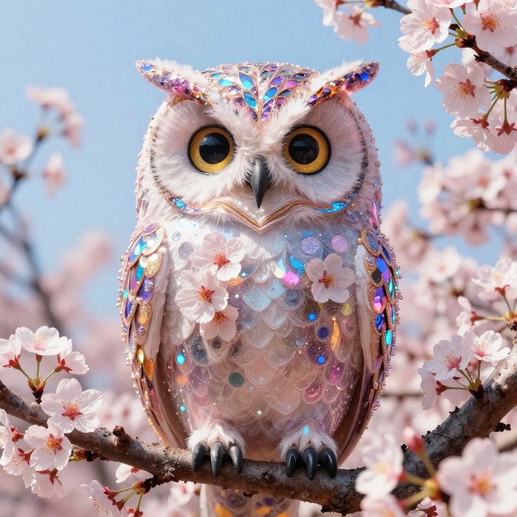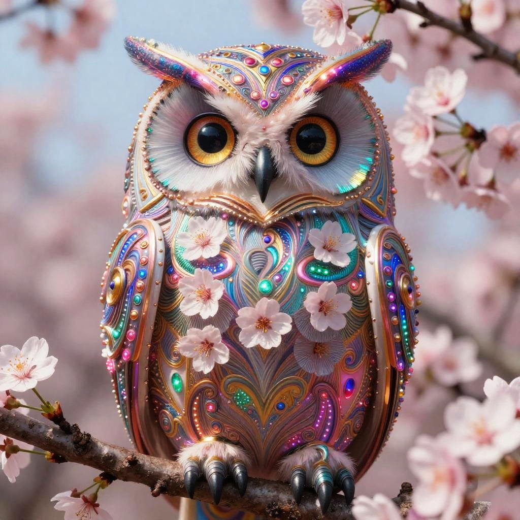 Satire Magical, insanely detailed, rich colors, mythic baroque fantasy by Gustav Klimt Electric colors, dazzling, an owl created and composed of cherry blossoms, electric colors, insanely detailed, very high definition and quality, clear and sharp, bright colors, colors, cherry blossoms 32k, watercolour, dreamily shimmering, surreal, unreal engine,