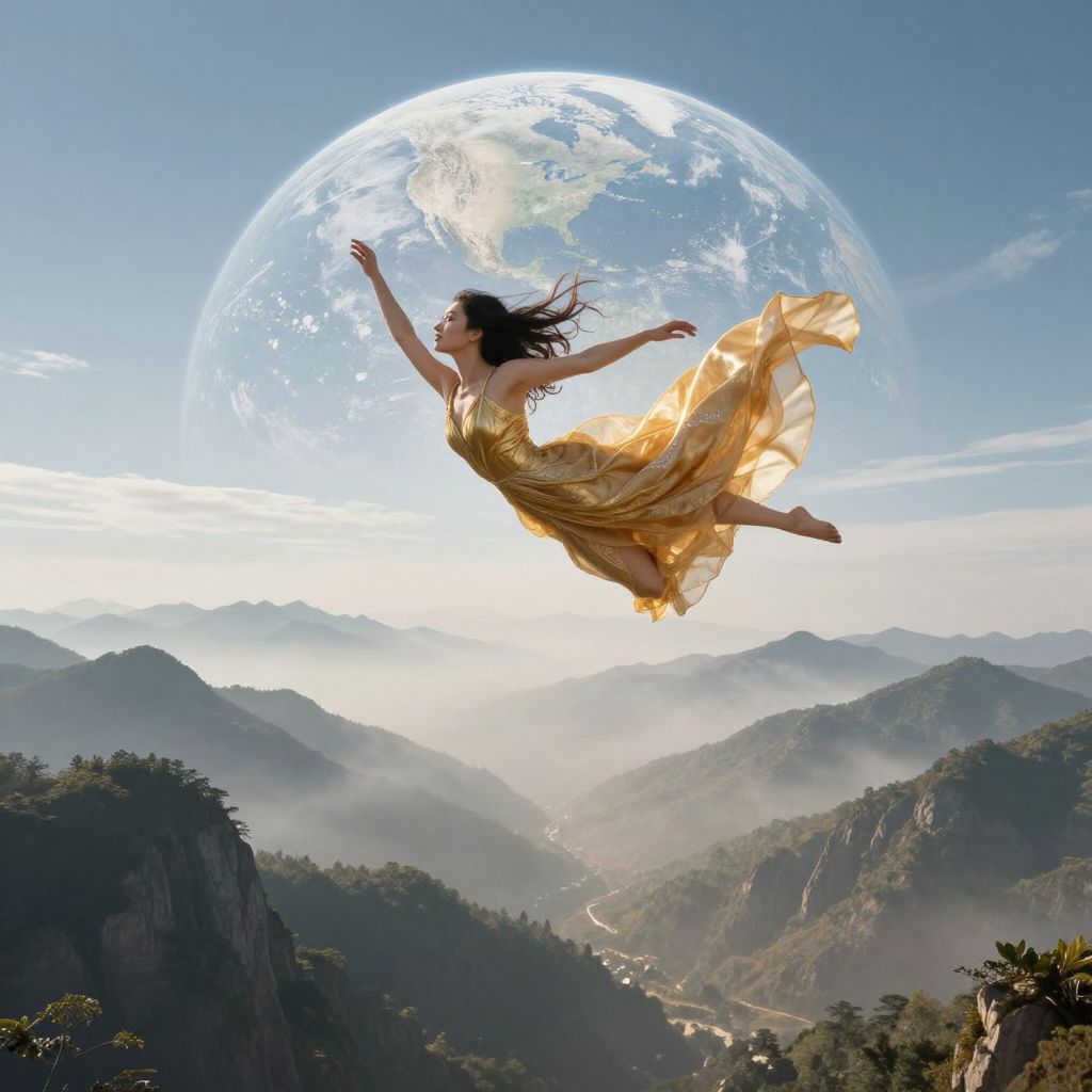 Photograph-like digital artwork depicting a woman with long black hair, wearing a flowing, semi-transparent yellow dress, floating mid-air against a backdrop of a massive, glowing Earth in the sky. The Earth is positioned above a misty, mountainous landscape with winding valleys and scattered trees. Her arms are outstretched, and the dress billows around her. The background features a clear blue sky with soft, white clouds. The overall color palette includes yellows, greens, blues, and whites, creating a surreal, ethereal atmosphere. The image conveys a sense of freedom and cosmic connection.