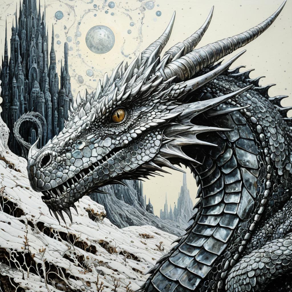 Futuristic mycelium spider with copper filaments, acrylic pour technique, overt symbolism, intricate sparkling details, mycelium elements, style by James Jean, low saturation, oil painting, white and gray