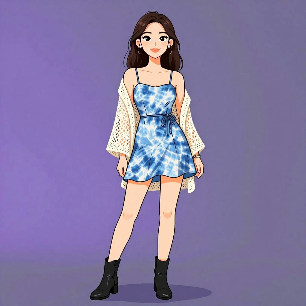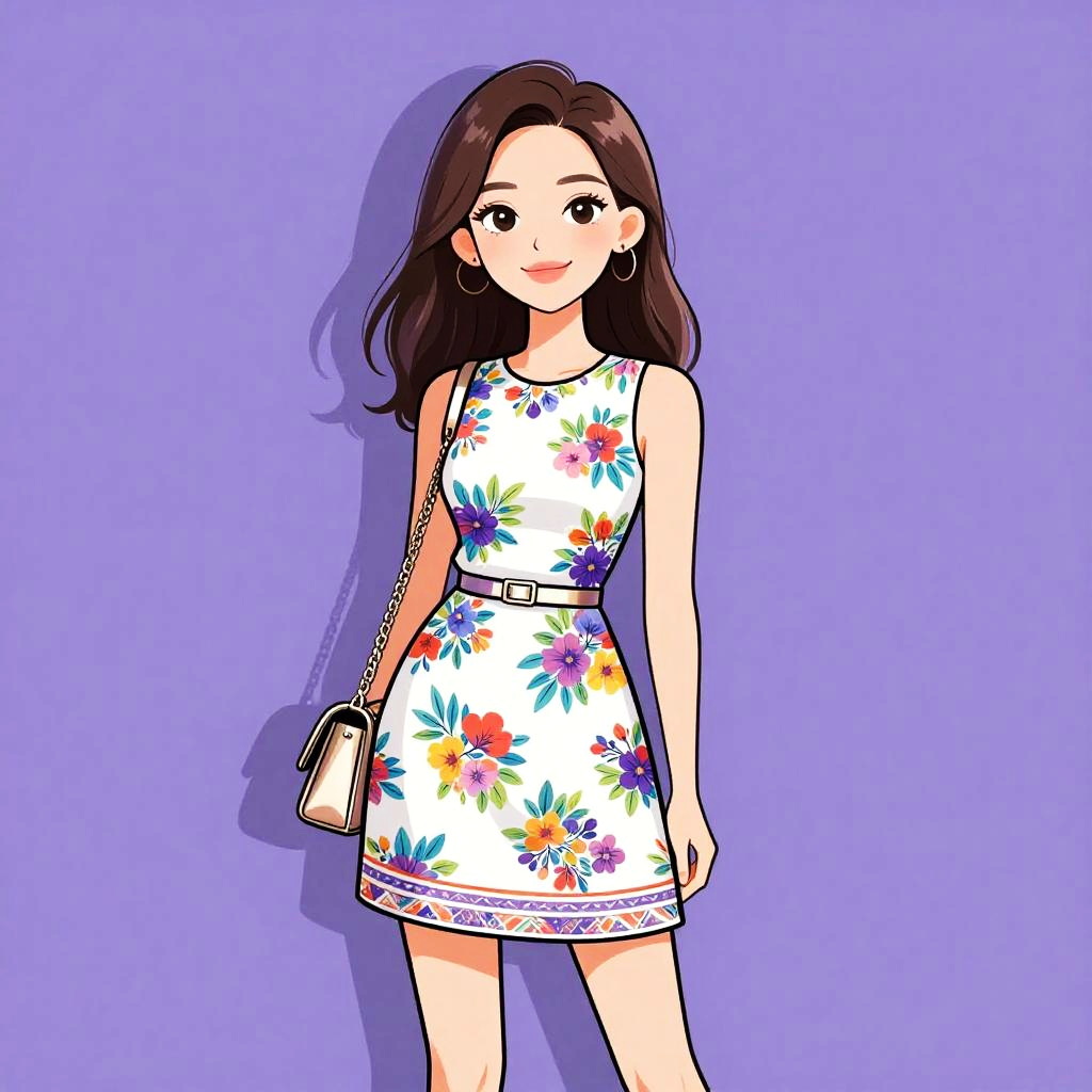 Woman with pretty face and pretty hair. smiling Woman, girly style, shift dress with a white base and multicolored floral print, sleeveless, high neckline, hemline just above the knee with contrasting border print, thin metallic belt at the waist, complementary metallic shoulder bag with chain strap. --sref 1467