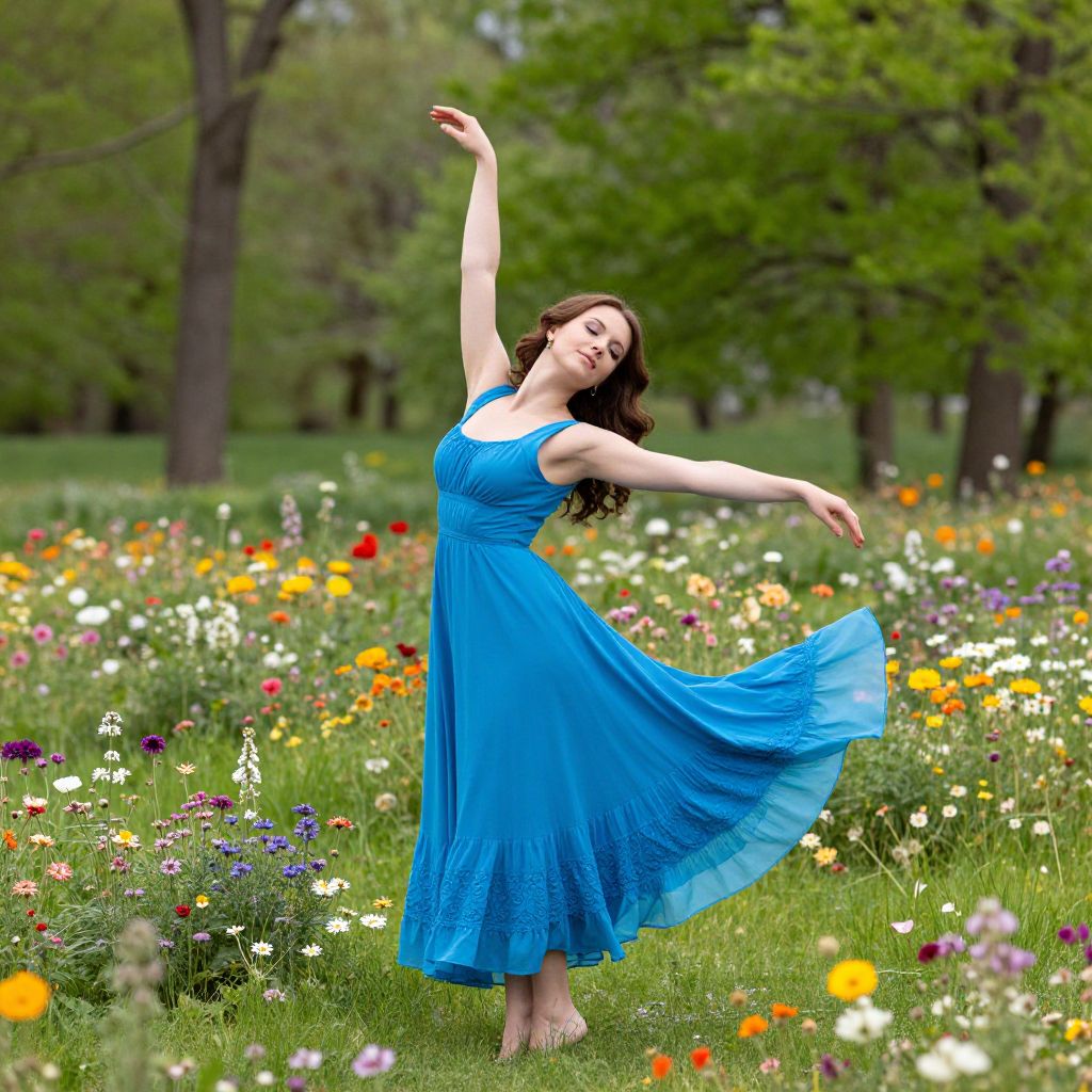 Photograph of a fair-skinned woman with wavy brown hair, wearing a flowing blue dress, dancing gracefully in a colorful meadow filled with wild