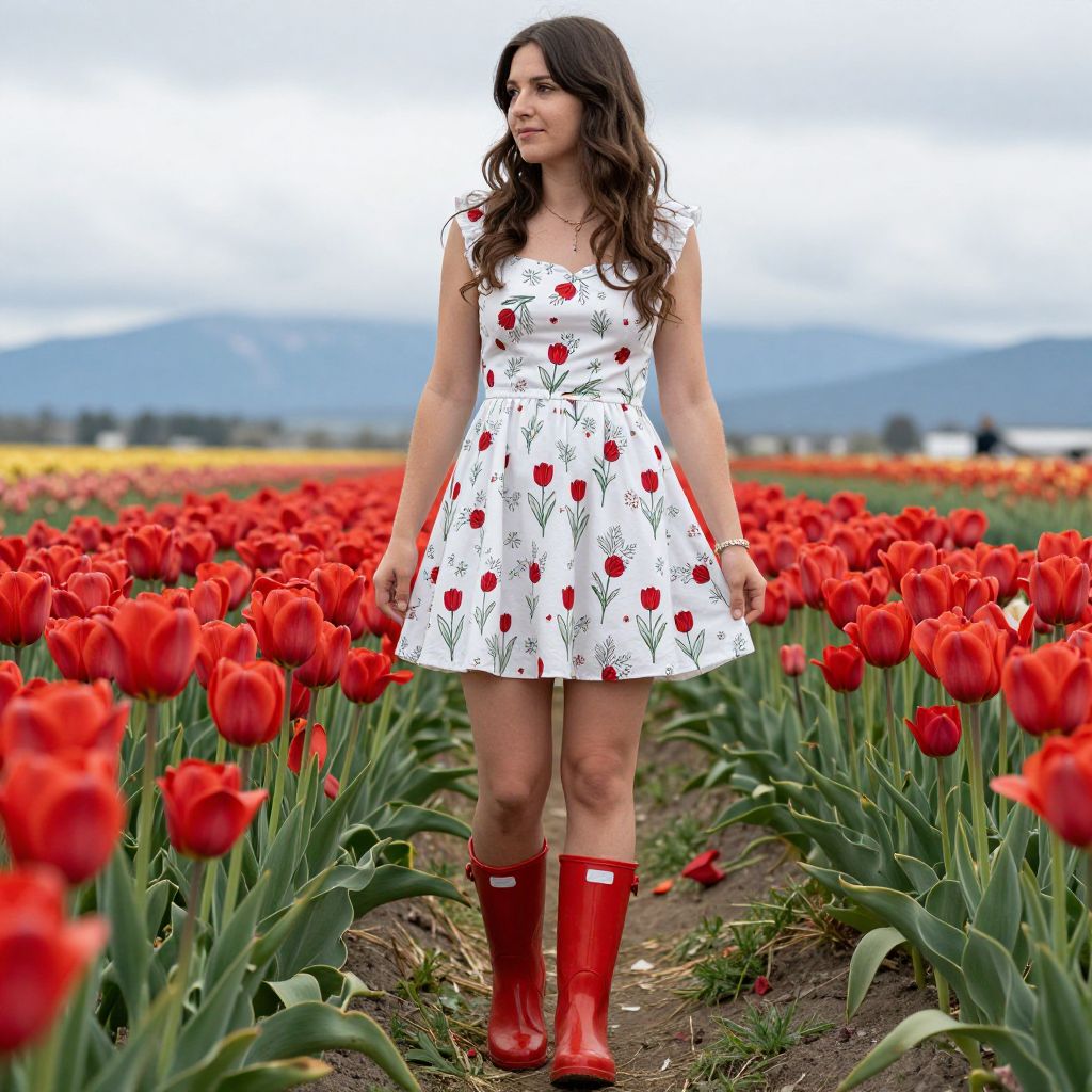 Woman standing amidst vibrant red tulips at the Skagit Tulip Fields, wearing a white floral dress adorned with red tulip patterns and complemented by bright red rain boots, with distant mountains and a cloudy sky forming the serene backdrop.