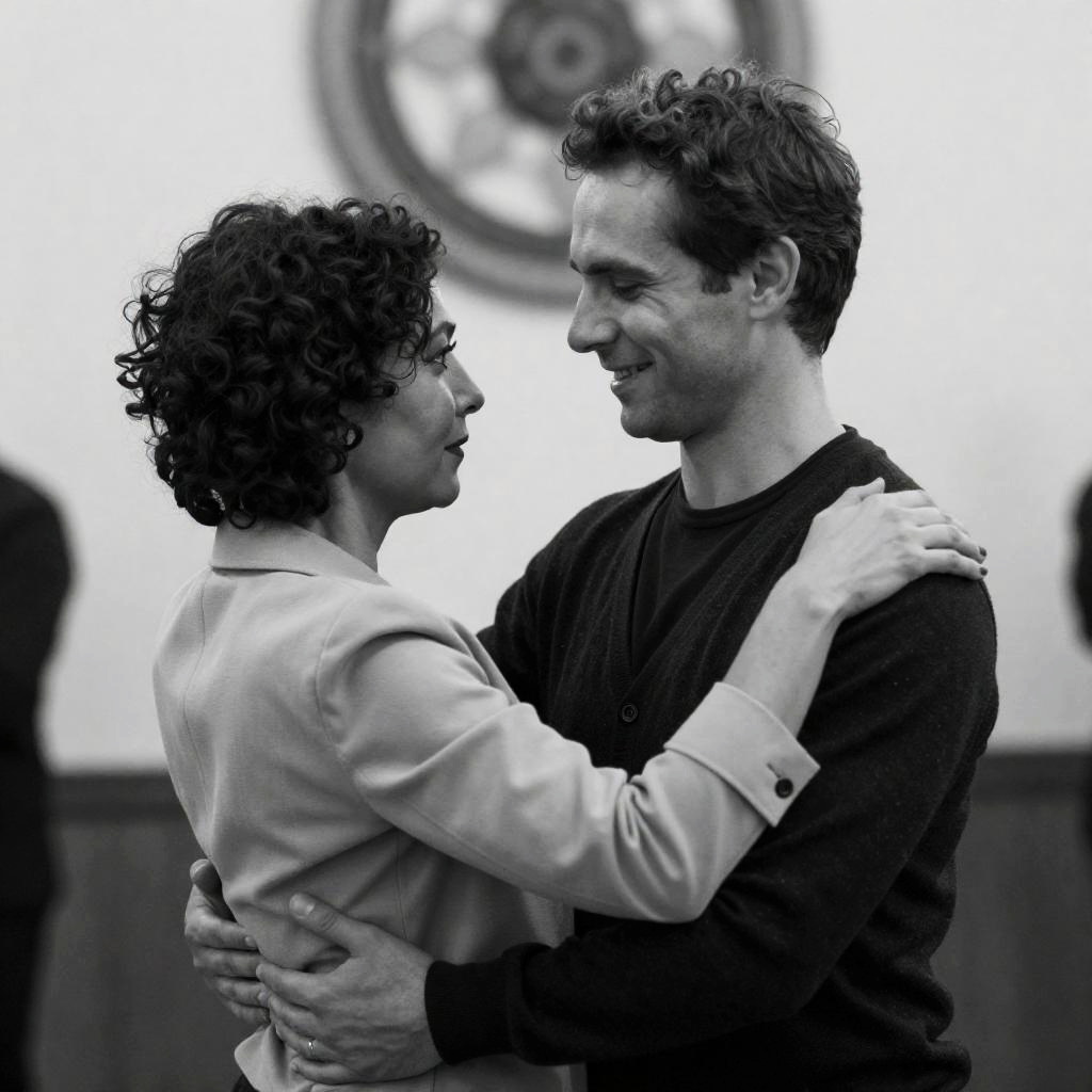 Black and white photograph of a dancing couple. Woman with short, dark hair, earrings, and bracelet gazes intensely at man with slicked-back hair, white shirt, and black tie. They are mid-dance, woman's arm around man's neck, man's hand on her back. Intense eye contact. Background is plain.