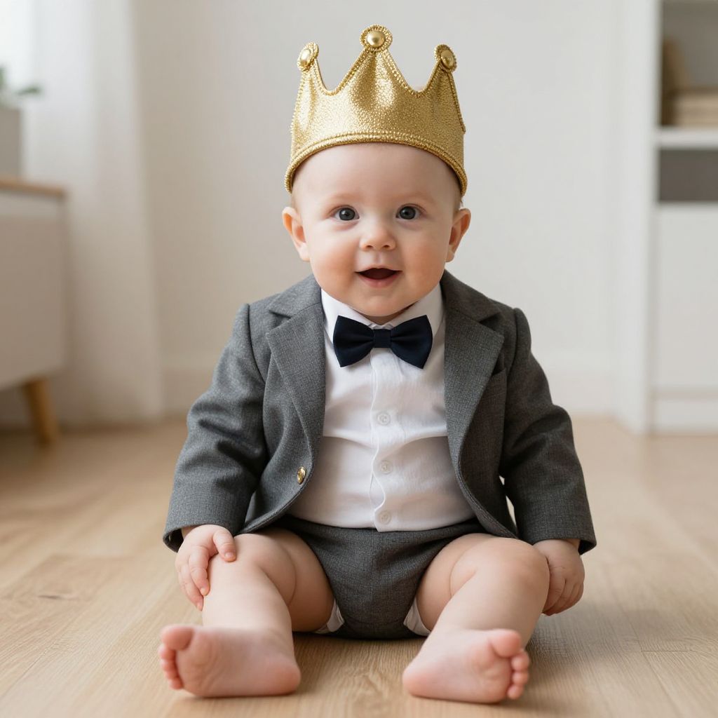 Homemade Infant Costume, baby wearing a crown and a jacket sitting on a floor
