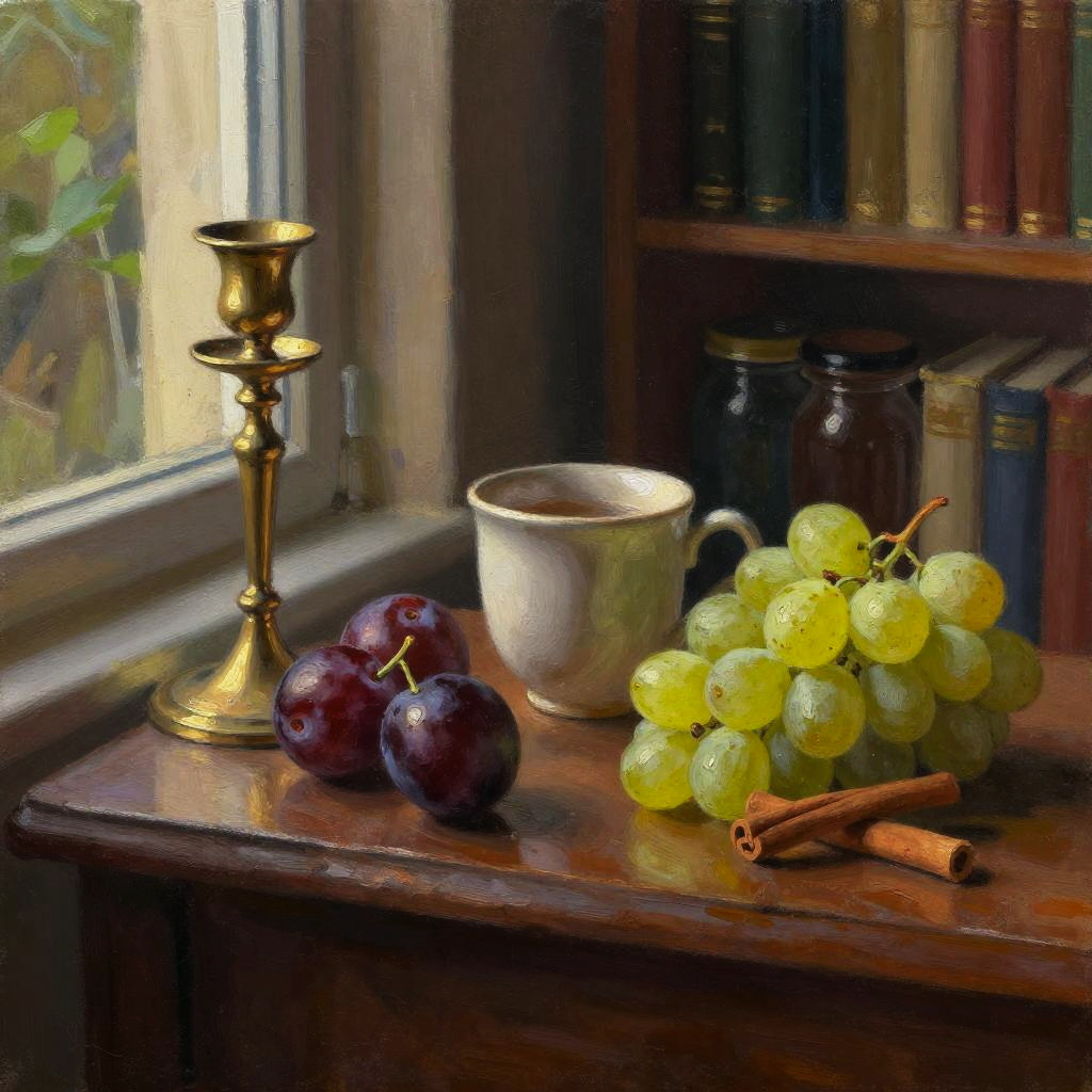 A playful, vibrant still life on a shadowed library window nook, featuring antique brass candlestick, deep burgundy plums, matte ceramic cup, olive green grapes, cinnamon sticks bundle. Rendered in moody chiaroscuro oil painting, with warm sunlight, soft shadows, bold color blocking, tactile textures, and a softly blurred shelf of plants and jars in the background; balanced composition, cozy domestic ambiance, shallow depth of field.