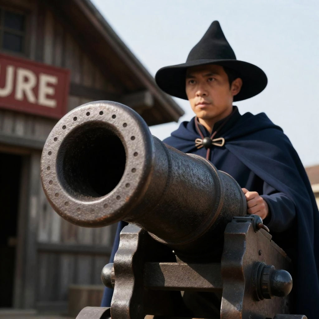 Man in dark blue cloak and black wide-brimmed hat holds a large, metal cannon with a round, perforated barrel. Wooden building with weathered ure and red sign in background. Clear sky. Man's face shows focused expression. Cinematic style.