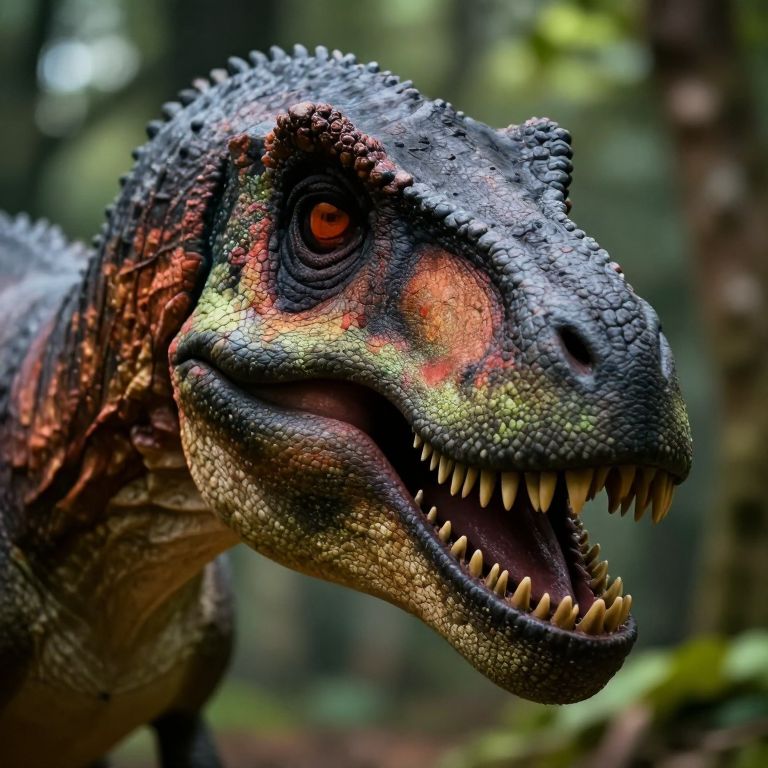 Photorealistic close-up of a colorful, detailed dinosaur head with sharp teeth, orange and green scales, and a fierce expression in a blurred forest background