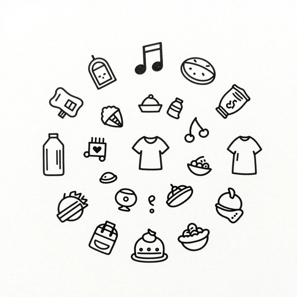 Simple cultural diffusion drawing, minimalistic approach, overlapping cultural icons like music, clothing, cuisine, hand sketch with clean background, easy to understand