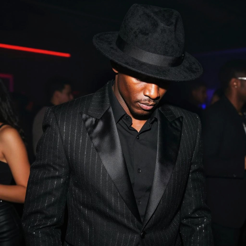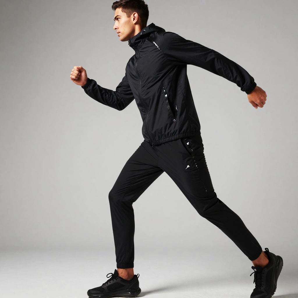 All black outfit men, worn by extreme sports athlete, featuring black lightweight windbreaker and tapered track pants, in midnight black with reflective black trims, captured in high-energy action shot with motion blur.