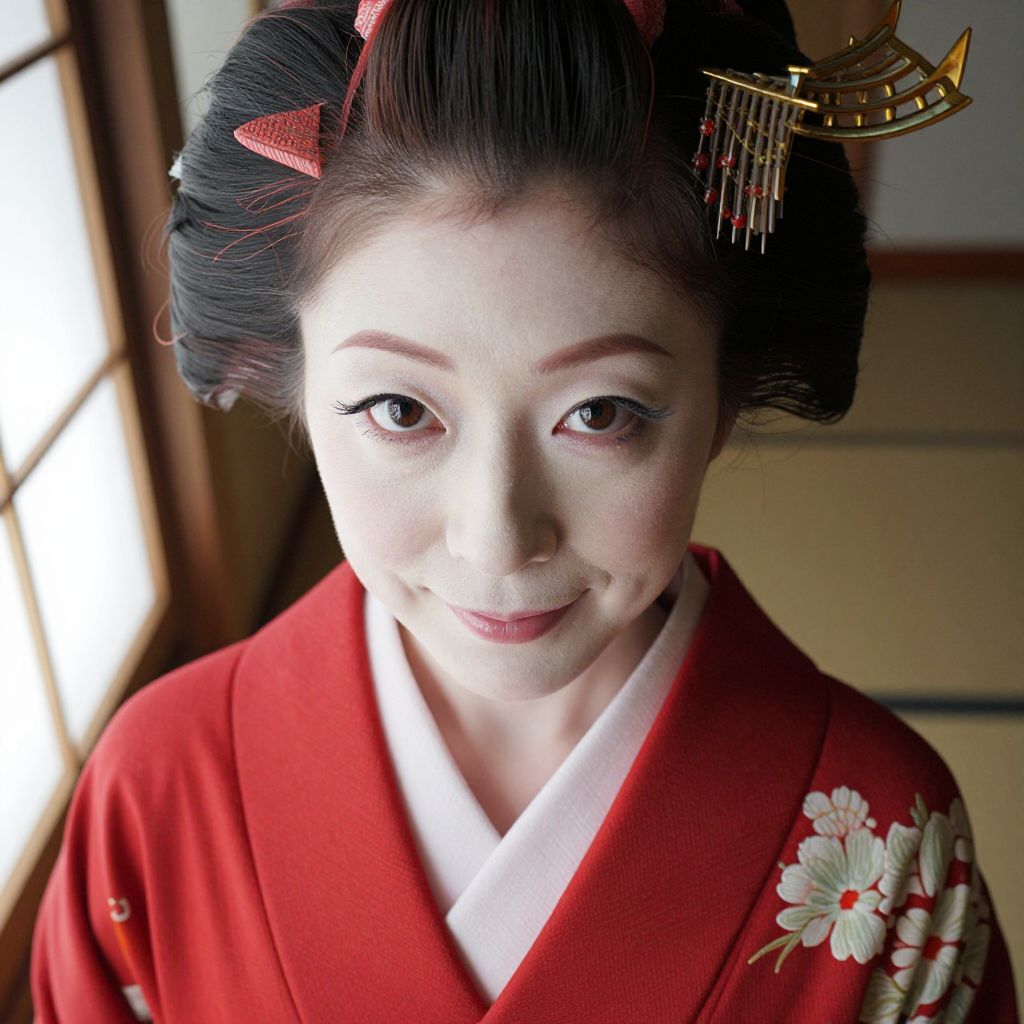 Photograph a Japanese-American woman in her early 50s with porcelain skin and captivating hazel eyes accentuated by thick black lashes. She gracefully dons a traditional red kimono, its vibrant hue contrasting against her pale complexion as soft daylight floods the scene through an adjacent window, casting delicate shadows across her serene expression. The image captures an unusual aerial perspective, showcasing both her gentle smile and intricate kimono patterns, evoking a sense of cultural heritage and introspection while inviting viewers to explore the complexities of her rich background.