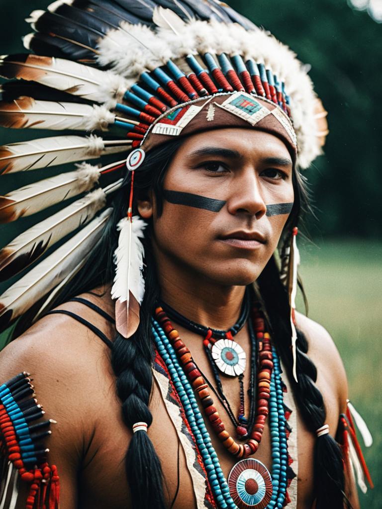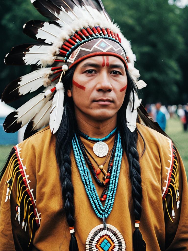 Man in American Indian Native costume, cosplay festival portrait, realistic look