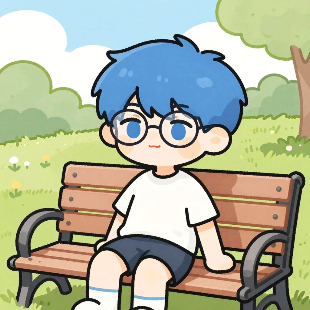 Close-up of a boy with blue hair, textured and vibrant strands, playful expression, pastel colored background with abstract shapes, modern graphic illustration style