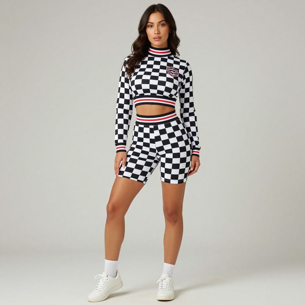 "Woman, sporty chic, checkered racing-inspired crop top with long sleeves and a high collar, matching bike shorts, black and white check pattern, red and white striped detail on the waistband and sleeve cuffs, small emblem on the chest, white lace-up sneakers, white socks, studio background with a plain light backdrop.. Sexy. Pretty face and beаutiful eyes. Big breasts."