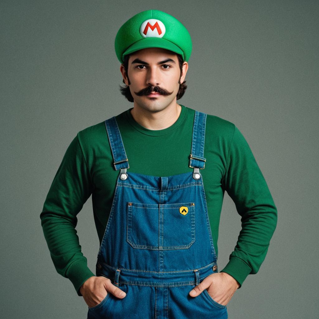 Super mario classic adult,1boy, overalls, male focus, solo, facial hair, green shirt, mustache, hat, green headwear, realistic, shirt, looking at viewer, long sleeves, blue overalls, standing, brown hair