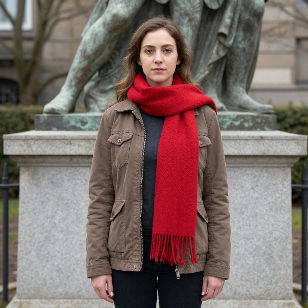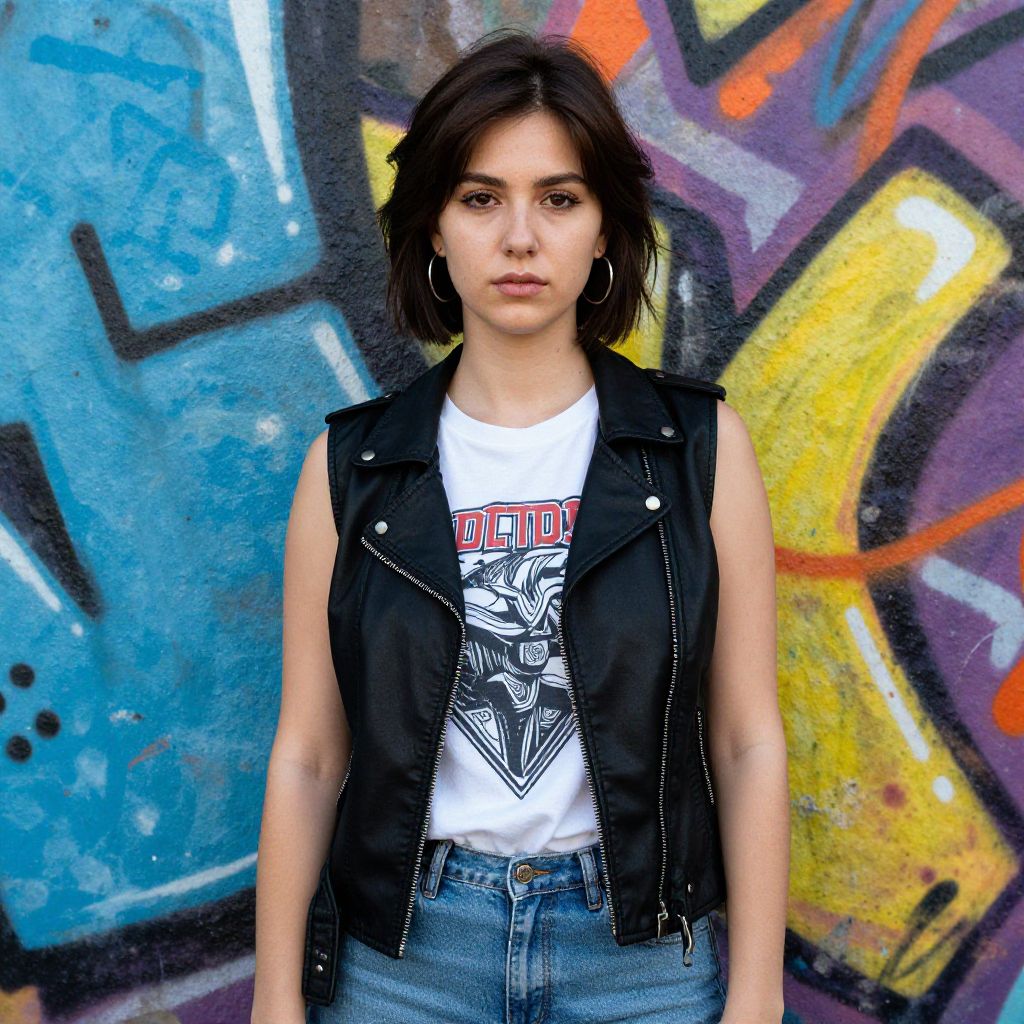 Photograph of a curly-haired woman with medium skin tone, wearing a black outfit, orange scarf, and black boots, standing against a graffiti-covered concrete