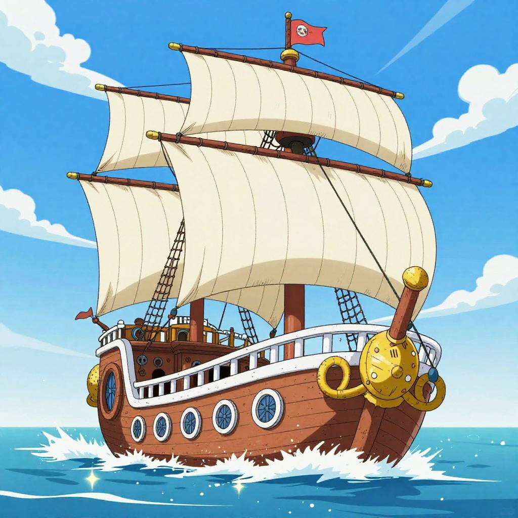 One Piece filter applied to a vibrant pirate ship sailing on a sparkling ocean under a bright blue sky, cartoon-style with exaggerated colors and dynamic lines, capturing the adventurous spirit of the anime.