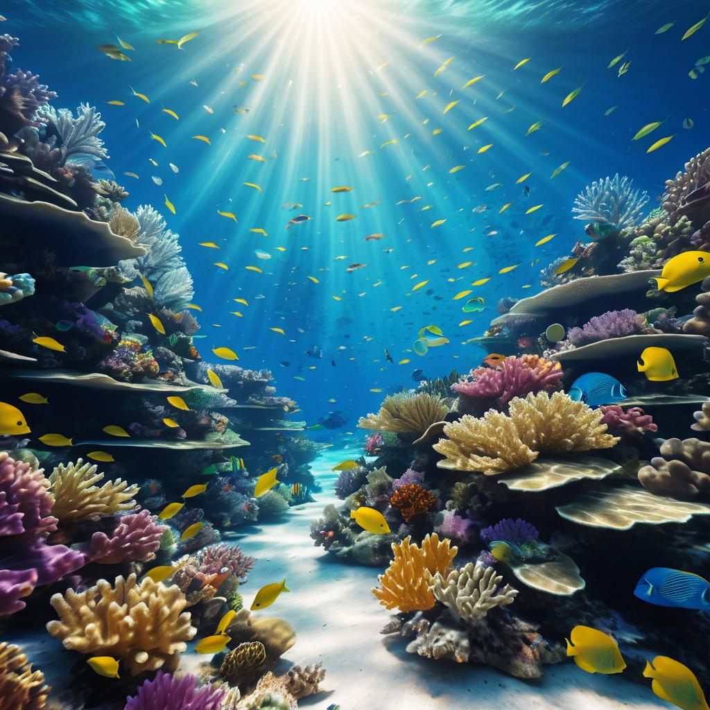 Photorealistic underwater scene of a vibrant coral reef illuminated by sunlight, featuring colorful corals and numerous small yellow fish swimming among the reef structures. The clear blue ocean water and sun rays penetrating the surface create a bright and lively marine environment captured with a 35mm lens.