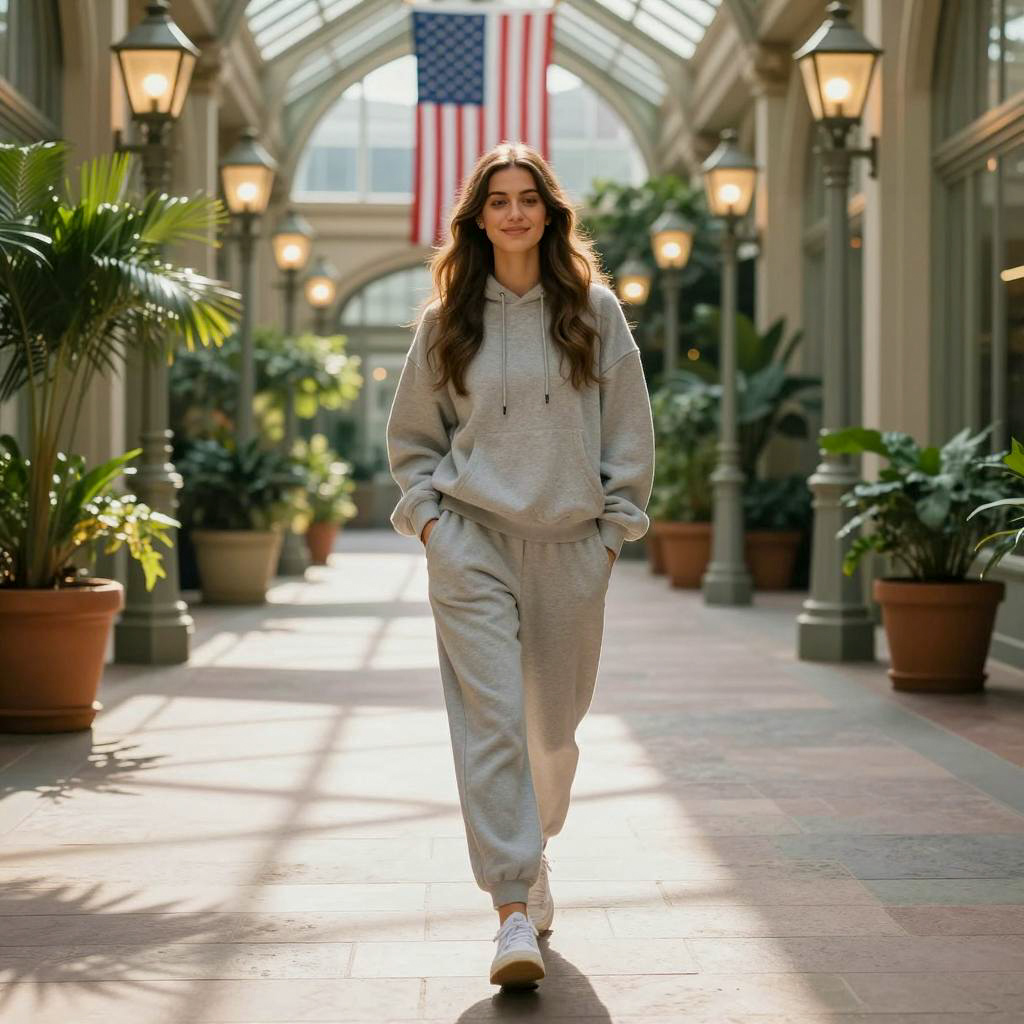 Woman sweatsuit costume, photograph of a young woman walking down a sunlit, indoor botanical hallway, wearing a light gray, oversized hoodie and matching joggers, hands in pockets, long brown hair, smiling, sunlight streaming from above, vintage-style street lamps with warm yellow lights on both sides, potted green plants lining the walkway, American flag in the background, high arched glass ceiling, stone tiled floor, casual, modern, stylish, natural light, soft shadows, daytime, urban greenhouse vibe