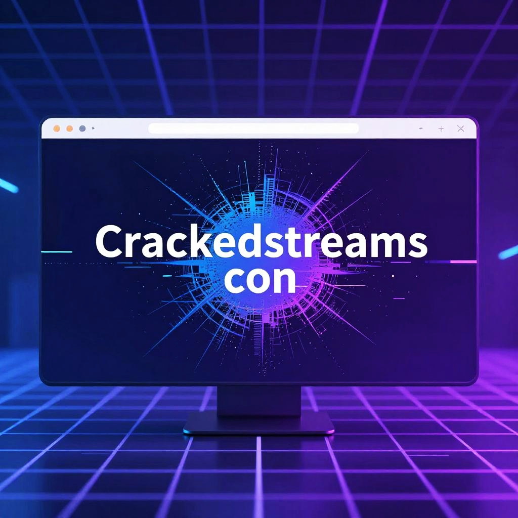 Crackedstreams.con streaming platform interface under cyber attack, pixelated distortions and cracks, neon grid background, futuristic UI elements, blue and purple color palette, dynamic glitch effects, immersive digital disruption aesthetic