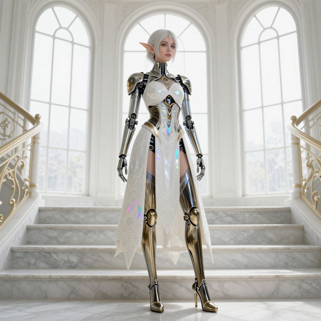 A beautifully detailed, intricately designed elven woman in a futuristic, biomechanical outfit stands in a bright, marble staircase with large arched windows, showcasing sleek, iridescent details and intricate white paint with dark gold transparent elements.
