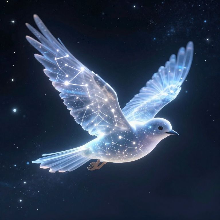 Digital artwork of a glowing white dove with constellation-like patterns on its wings, soaring against a starry night sky.
