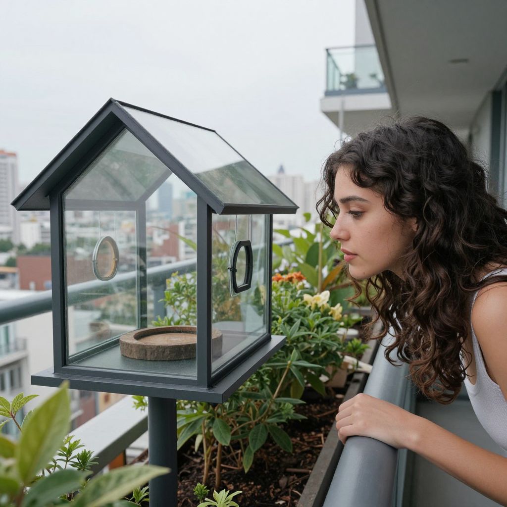 Curly-haired woman in white tank top observes modern glass birdhouse with wooden tray on balcony, surrounded by plants and urban buildings.