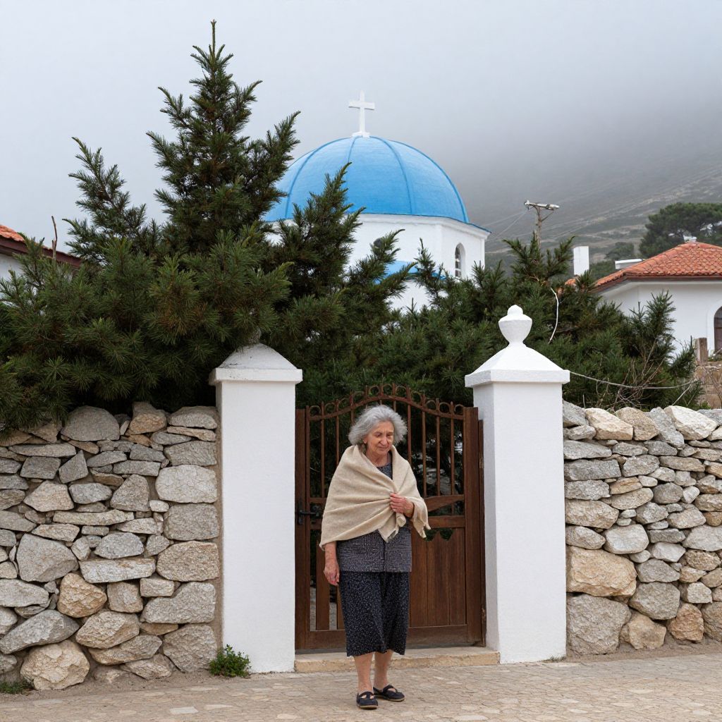 A quiet coastal village with a blue-dome church partially hidden behind pine trees, fog gently drifting in the background, a elderly woman with silver hair and a soft smile walking toward the entrance, wind gently moving her shawl