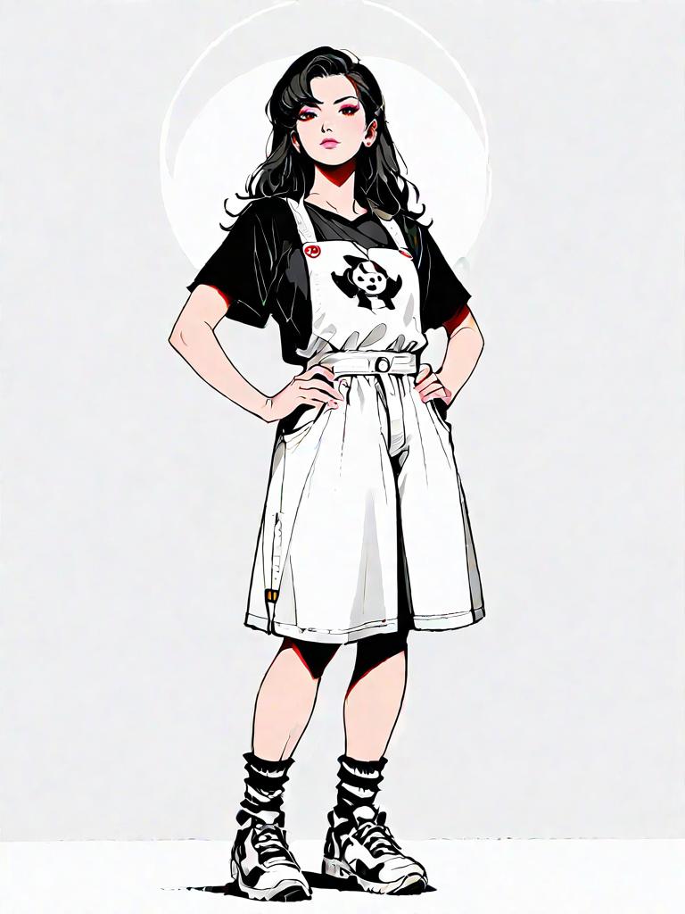 Digital illustration of a woman wearing a white bohemian-style dress with black and red eye-like patterns on the wide bell sleeves. The dress features a high collar, front buttons, and a cinched waist with a wide black belt decorated with an intricate gold buckle. She has long black hair with blunt bangs and red makeup. Her wide-brimmed hat is cream with a red underside and black and gold decorative elements, complementing her striking look.