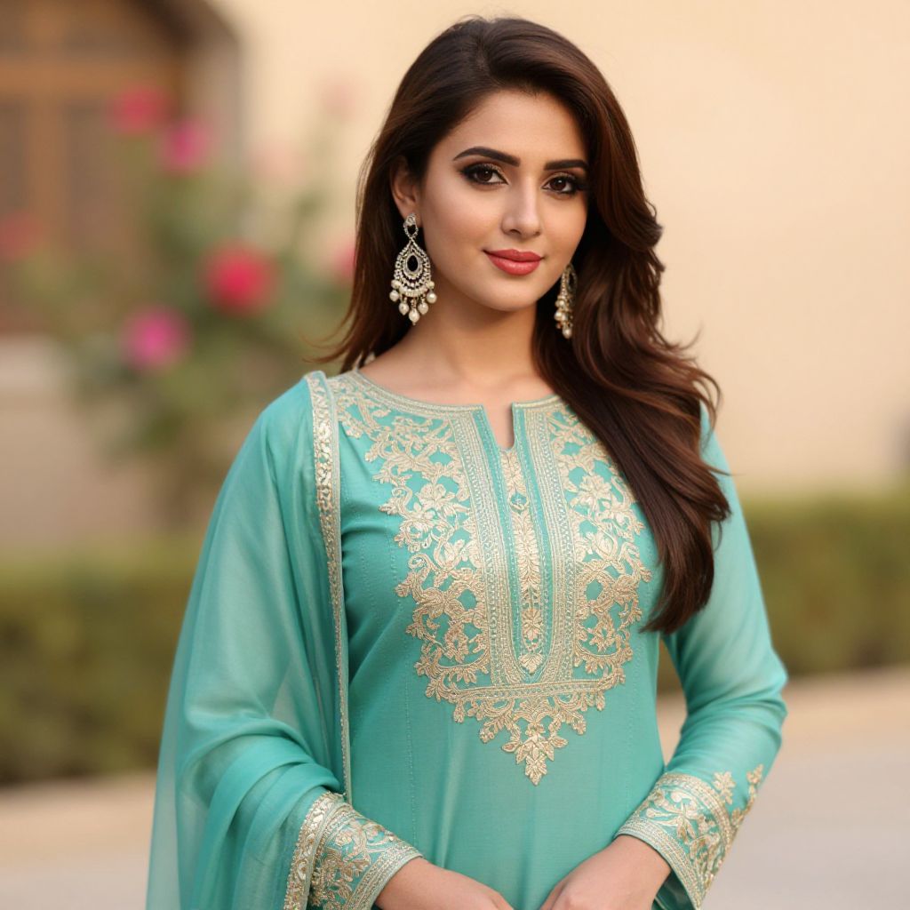 Photograph of a young South Asian woman with long, wavy dark brown hair, wearing a teal traditional Pakistani kameez adorned with intricate gold embroidery on the chest and cuffs. She has a medium skin tone, dark eyebrows, and is wearing large, ornate silver earrings. Her makeup includes bold eyeliner and red lipstick. She stands outdoors against a blurred beige wall and green shrubbery with pink flowers in the background. Her expression is calm and confident, with a slight smile. The image has a soft, warm lighting that enhances the colors of her attire and the background.