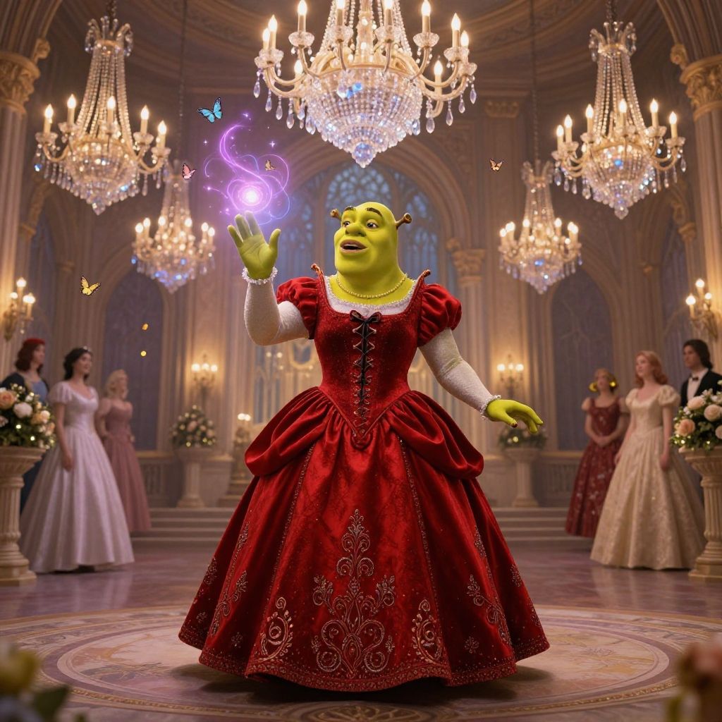 Shrek fairy godmother wearing an elegant red gown with intricate embroidery, casting a spell inside a sparkling castle ballroom, crystal chandeliers overhead, magical aura and butterflies fluttering around, highly detailed fantasy art, rich hues