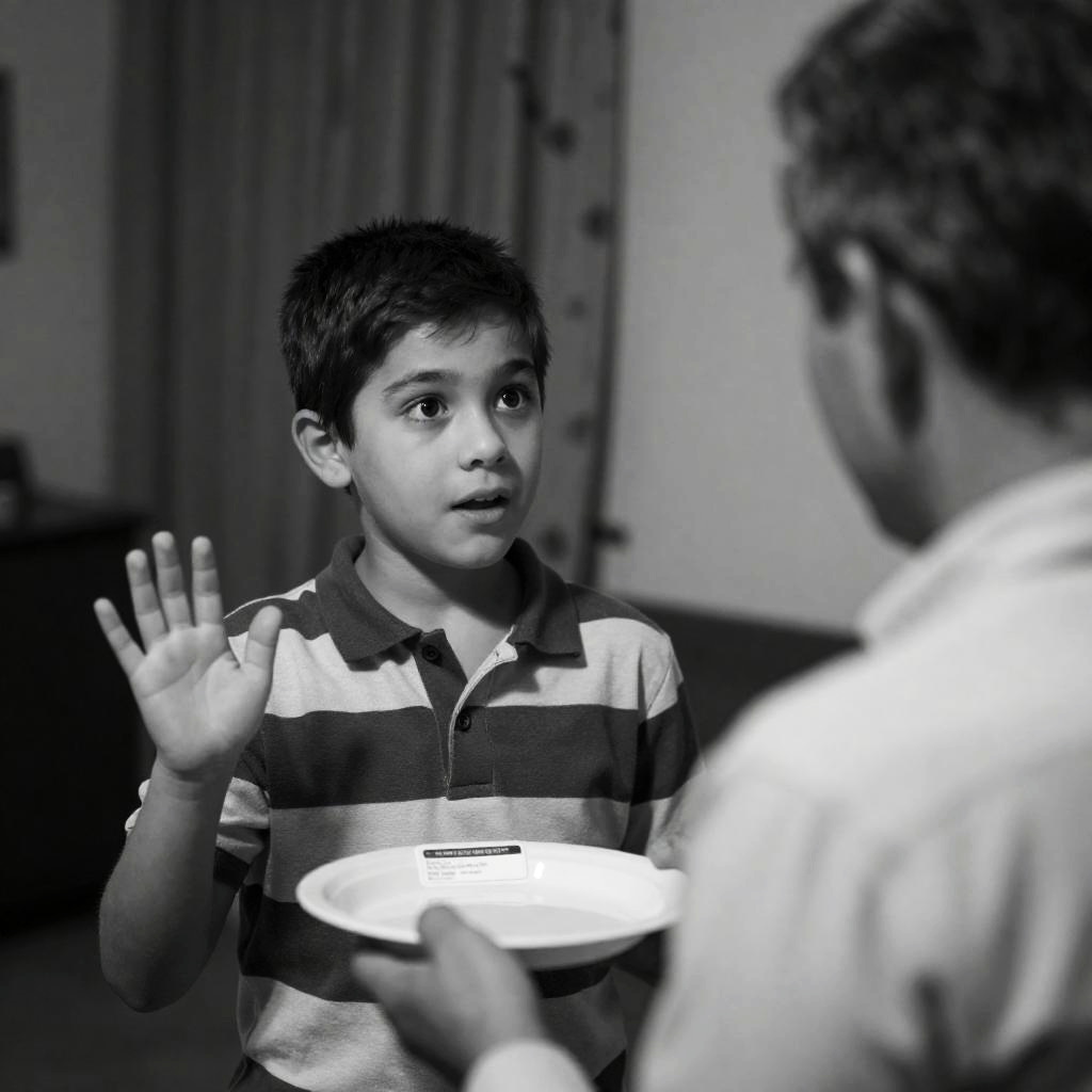 Black-and-white photograph of two boys, mid-conversation. Boy in striped shirt, left, holds can, wide-eyed, looking at other boy, right, who has short dark hair, slightly turned away. Dimly lit background. Boy in striped shirt in foreground, other boy in background.