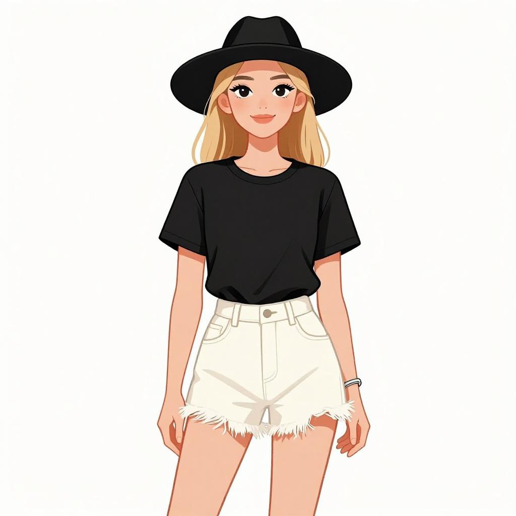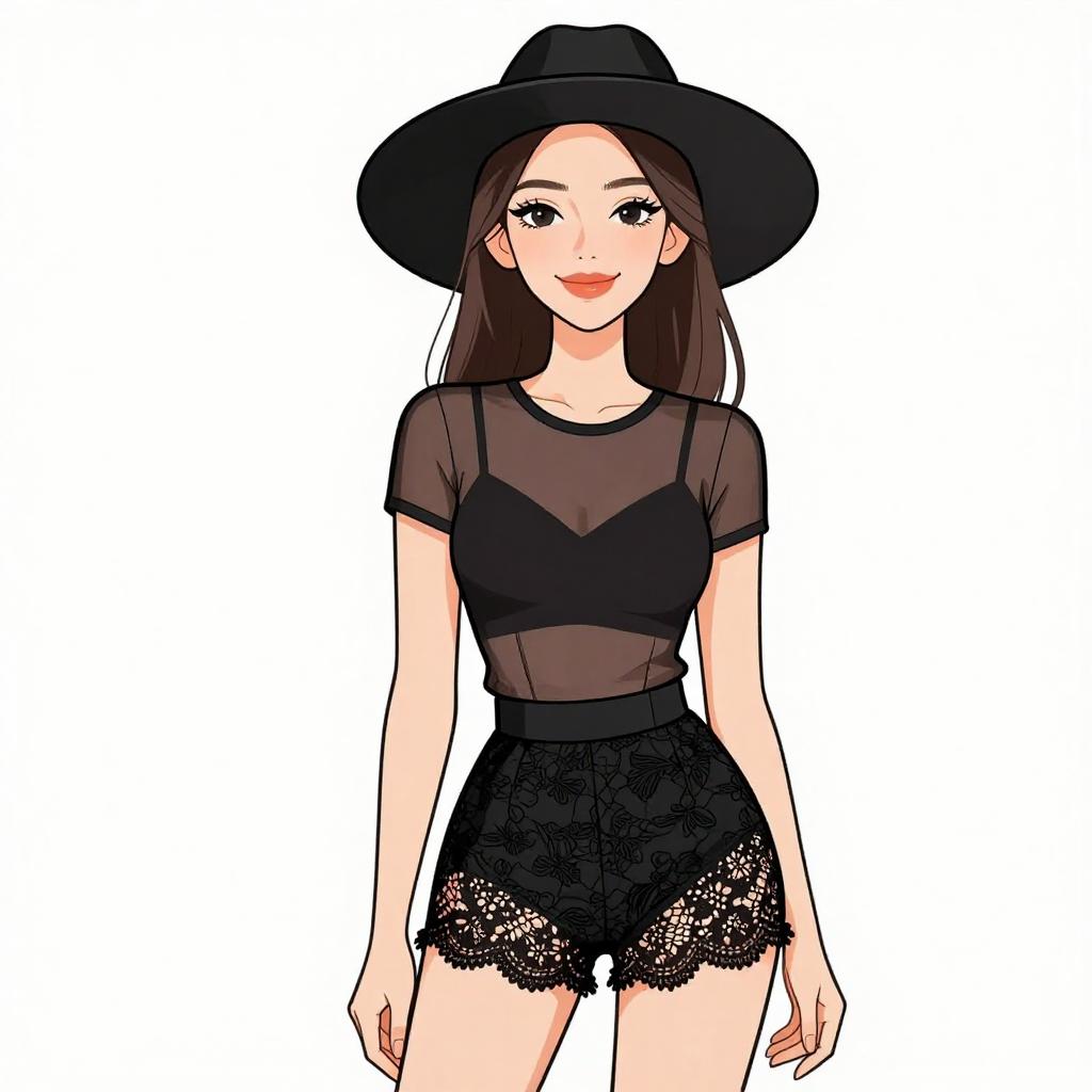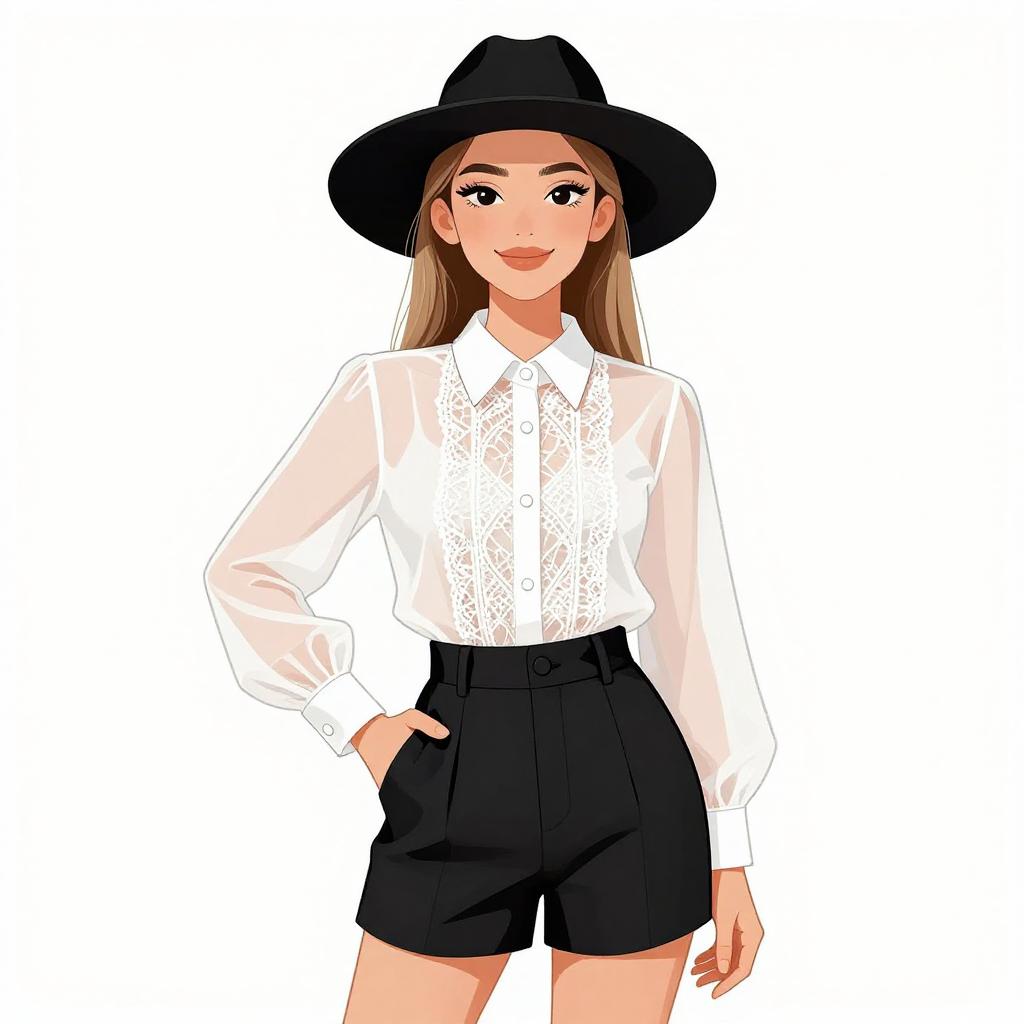 Woman with pretty face and pretty hair. smiling Woman, contemporary casual, sheer white button-up blouse with pointed collar, vertical lace panel detailing, long billowy sleeves, button cuffs, tucked into high-waisted black shorts, tailored fit, waistband, side pockets, wide-brimmed black felt hat, minimalistic makeup, straight blonde hair, plain white studio background. --sref 1467