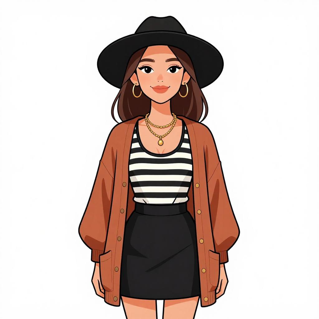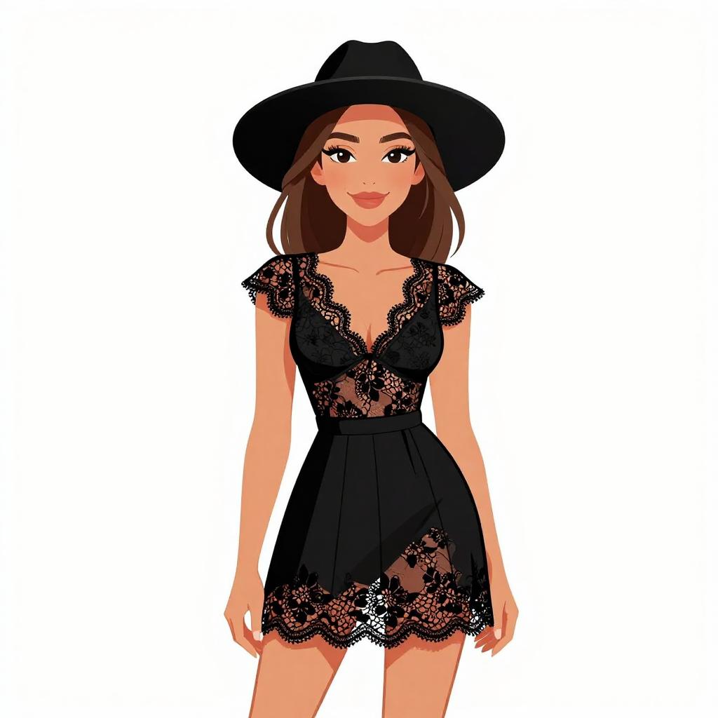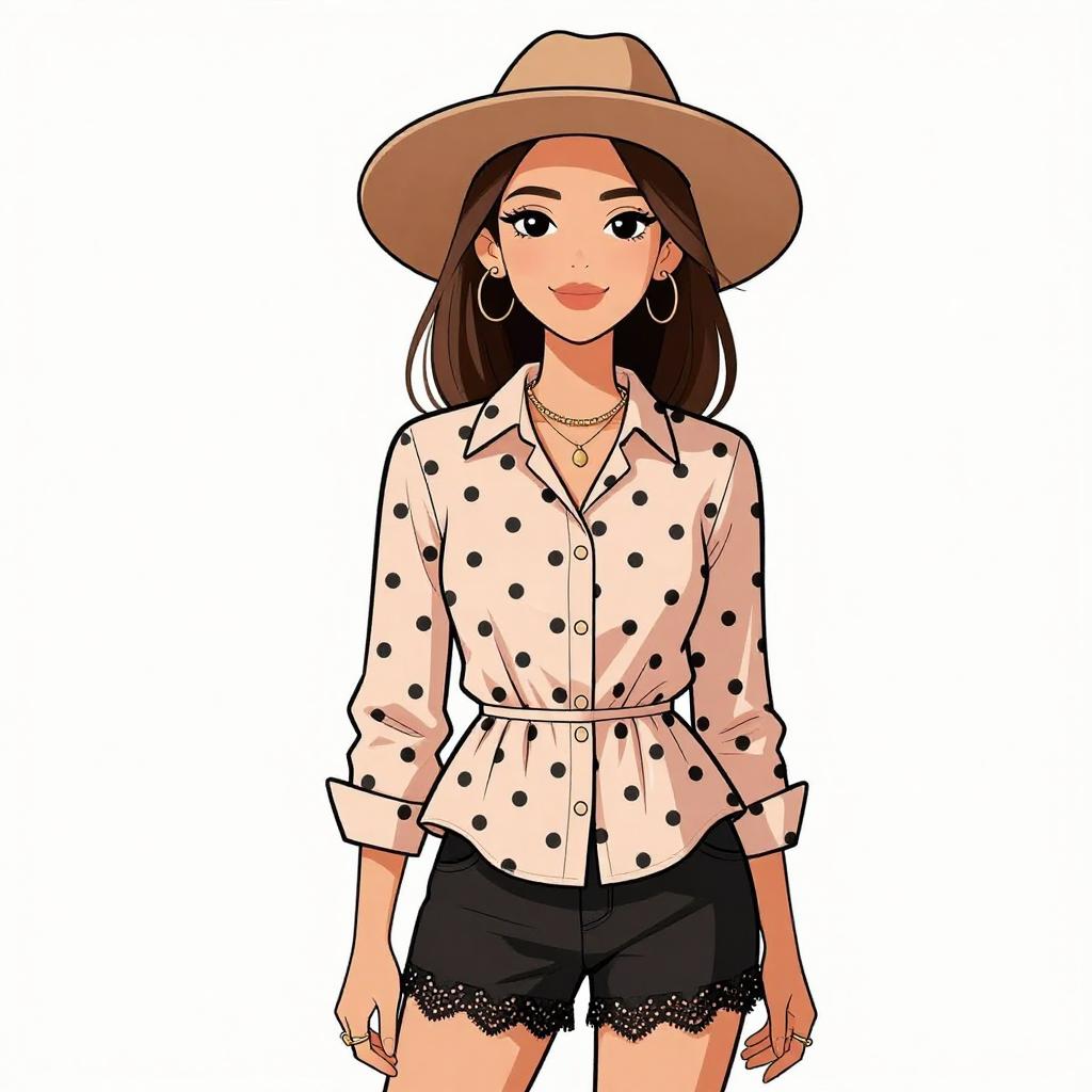 Woman with pretty face and pretty hair. smiling Woman, contemporary casual, sheer white button-up blouse with pointed collar, vertical lace panel detailing, long billowy sleeves, button cuffs, tucked into high-waisted black shorts, tailored fit, waistband, side pockets, wide-brimmed black felt hat, minimalistic makeup, straight blonde hair, plain white studio background. --sref 1467