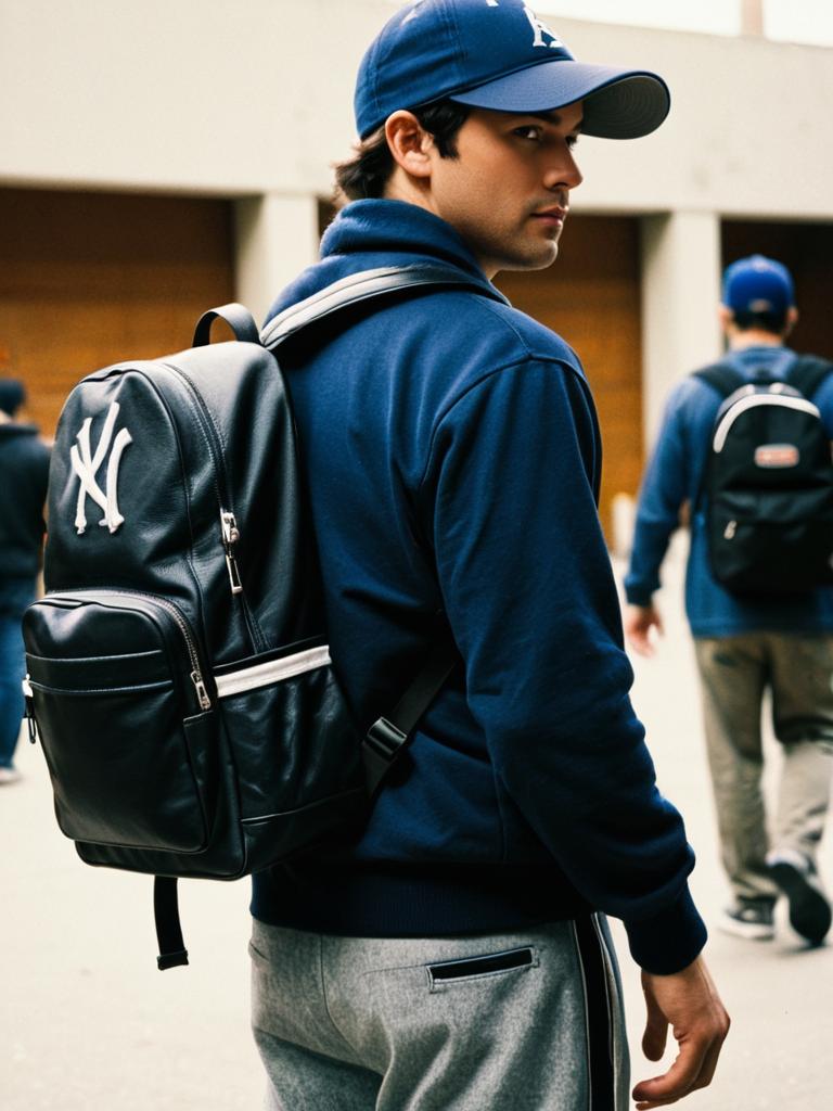 Benchwarmers costume, 1boy, male focus, baseball cap, hat, solo, realistic, backpack, backwards hat, bag, pants