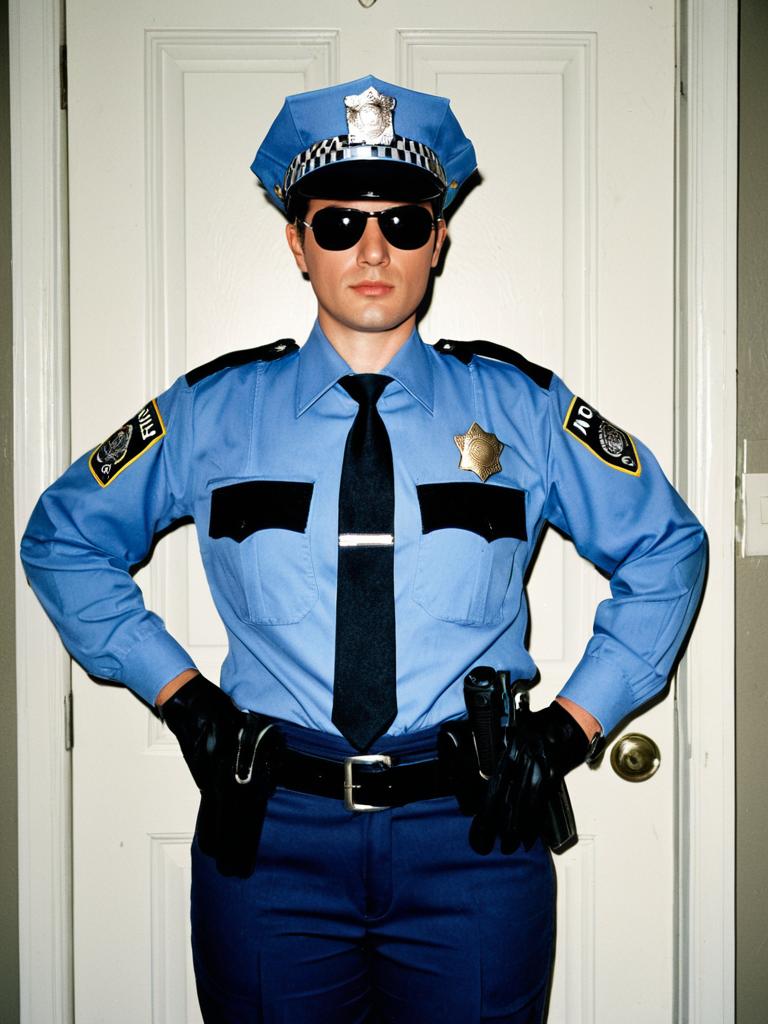 Funny police costume, police uniform, police, 1boy, male focus, policeman, gloves, sunglasses, police badge, solo, hat, belt, shirt, blue pants, uniform, pants, necktie, police hat, collared shirt, white shirt, closed mouth, jacket, long sleeves, black belt, looking at viewer, standing, hands on own hips, blue jacket, policewoman, belt buckle, buckle, white flower, door, black necktie, pocket, wing collar