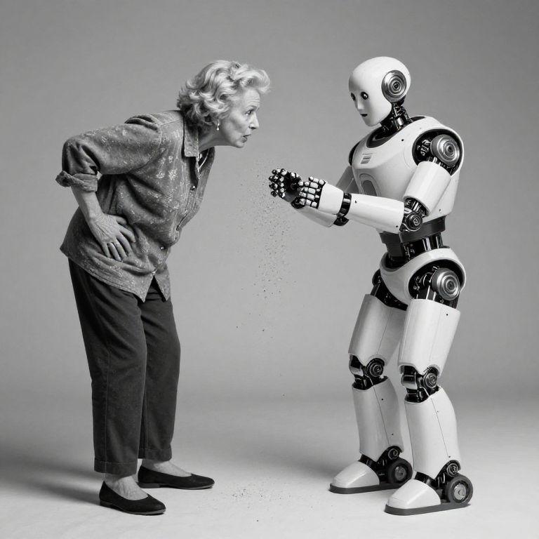 Waistcoat hipster Grandma scolding a hightech robot for getting scruffs on his armor, surreal, light particles, award- winning photojournalism, shot with Hasselblad, black and white photography,