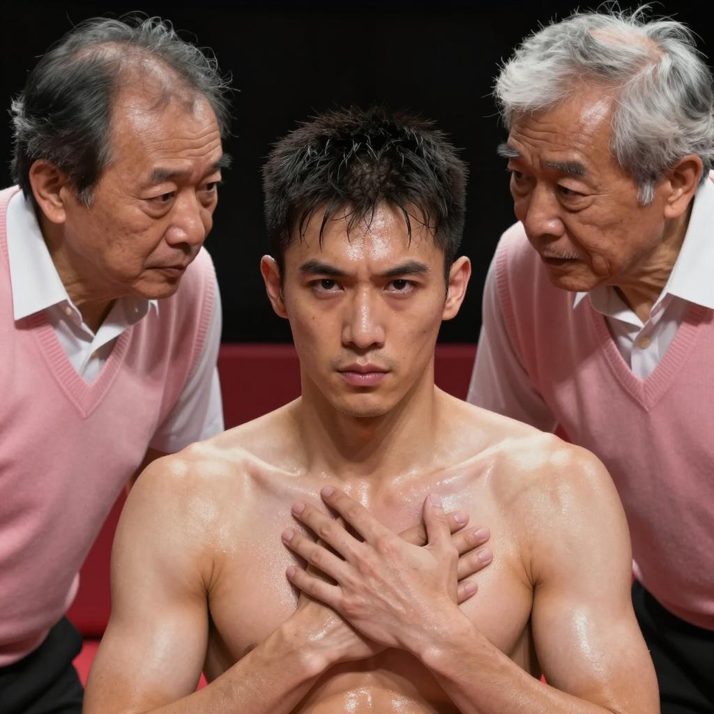 Muscular Asian man with dark hair wearing a white headband with red stripes, shirtless, licking his finger, in a dimly lit room. Background includes blurred spectators. Man's expression is focused. 5 people in background, 2 visibly blurred.