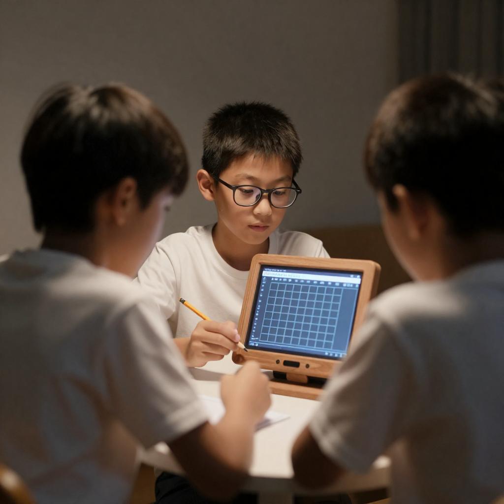 Photograph of two young Asian boys in a dimly lit room. One boy with glasses and short brown hair, wearing a white shirt, holds a pencil and looks at a small, wooden-framed monitor displaying a digital grid. The other boy, with short brown hair, faces him, partially shadowed. Both focus intently on the monitor.