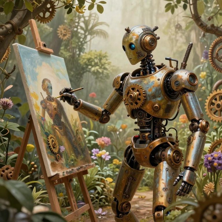 A surreal and imaginative portrait of a cyborg poet in an idiosyncratic style reminiscent of Hieronymus Bosch, with intricate mechanical features blending seamlessly into lush foliage and vibrant, otherworldly landscapes. The scene is captured from an aerial perspective, showcasing the poet's delicate, almost ethereal movements as they recite their verses amidst a backdrop of fantastical creatures and mysterious symbols. The colors are rich and bold, evoking a sense of wonder and curiosity, while the lighting is both enchanting and enigmatic, casting long shadows that dance across the scene in an ever-changing interplay of light and shadow. This captivating image celebrates the beauty of nature, technology, and the power of the written word, inviting viewers to explore the depths of their imagination and ponder the mysteries of existence.