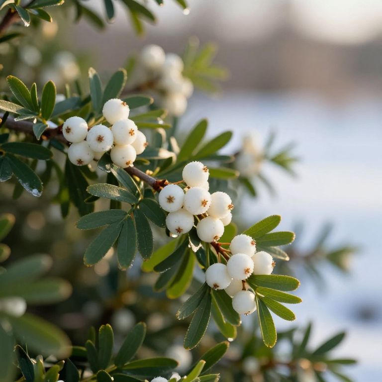 Mistle twig adorned with clusters of white berries and lush green foliage, set against a dreamy winter landscape, gentle bokeh effect, warm sunlight casting delicate shadows, festive and natural ambiance, macro shot.