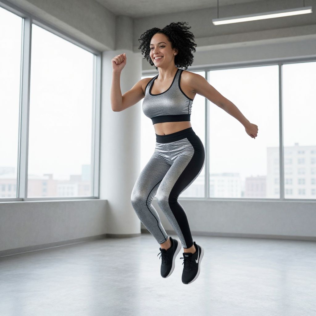 A woman with curly black hair and a warm smile in a sleek silver and black workout costume made from advanced breathable fabric, doing a high-intensity jump routine in a well-lit, minimalist fitness studio with large windows overlooking a city skyline. The woman has big tits and cute face