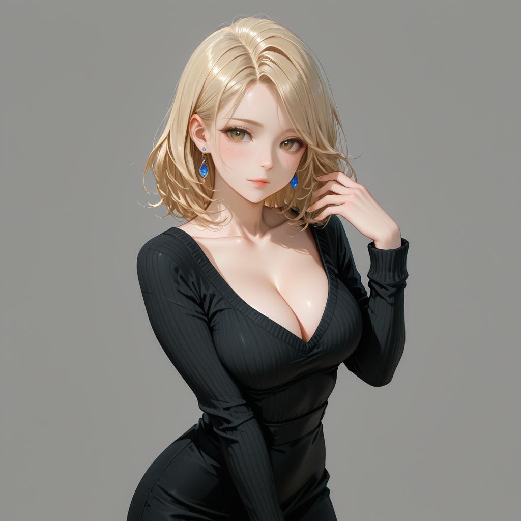 A digital illustration of a young blonde woman with medium-length hair wearing a fitted black ribbed sweater dress with long sleeves. She has fair skin, light makeup with red lips, and striking blue earrings. The woman is posing against a simple grey background, looking directly at the viewer with parted lips and one hand raised near her face.