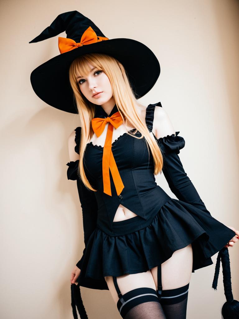 Photo-realistic cosplay photo of person in abigail williams (second ascension) (fate) costume. 1girl, red eyes, blonde hair, very long hair, parted bangs, small breasts, navel, witch hat, black headwear, black panties, hat bow, revealing clothes, black thighhighs, topless, orange bow, black bow, polka dot bow, bare shoulders, forehead, tentacles, keyhole, teddy bear, black hatlifestyle stock photo, shallow depth of field, lifestyle stock photography, shallow depth of field, natural lighting, warm tones, soft background blur, candid moments, vibrant colors, realistic textures, modern casual clothing. full body shot